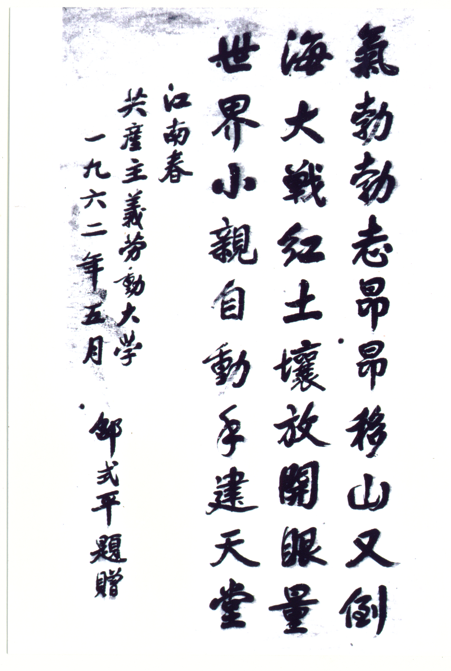 編者手記:這個故事在共大師生中流傳甚遠(yuǎn),一方面緬懷邵省長的敬仰之情,另一方面也稱贊共大師生堅定并保持“半工半讀”“不要國家一文錢”的艱苦奮斗精神。共大師生始終堅持不叫苦,自力更生;始終堅持聽黨的話跟黨走;始終堅持永遠(yuǎn)胸懷建功于新中國的樂觀信念、堅定信念與必勝信念。
