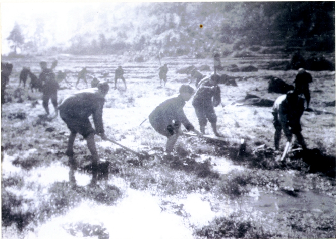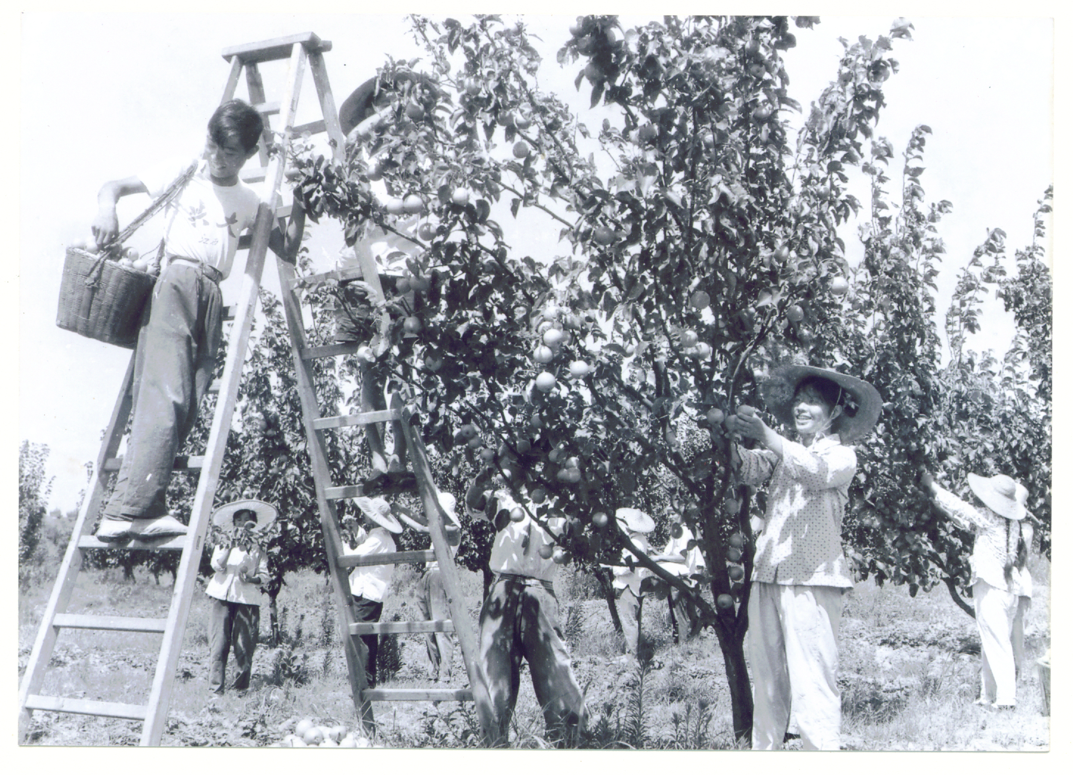 每年的插秧和耘禾勞動同樣辛苦。早晨去插秧或耘禾,赤腳踏進水田,冰冷的水田即刻使人感到刺骨的疼痛。水中多有螞蝗,叮咬著泡在水里的師生們的雙腳。每年還要在丘陵、旱地上勞動,主要是挖樹坑、栽果樹,種植和收割紅薯、芝麻等。每人每天挖八個樹坑,挖好后聽候檢查,不合格則返工,合格者撒下基肥后再栽上梨樹苗、桃樹苗等,再進行除草、松土等養護,來年就有可能有收益了。