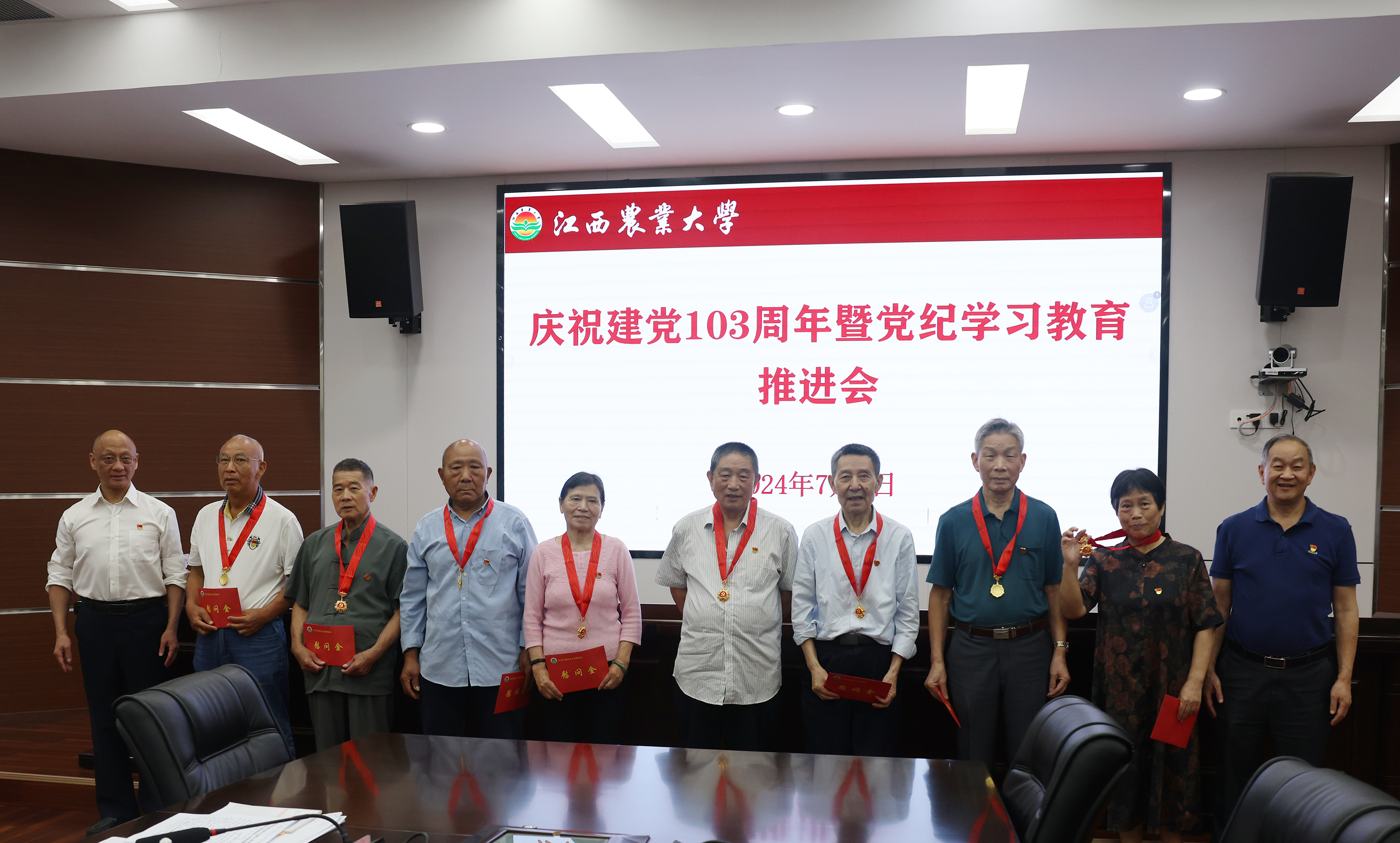 7月1日下午,我校慶祝建黨103周年暨黨紀學習教育推進會在校行政樓二樓圓形會議廳召開。校領導黃路生、魏輔文、樊后保、曾志將、劉木華、張高亮、王文君、劉斯龍、游金明出席,各二級黨組織書記,機關各支部書記,“兩優一先”受表彰代表,“光榮在黨50年”紀念章獲得者代表參加會議。副校長張高亮主持會議。