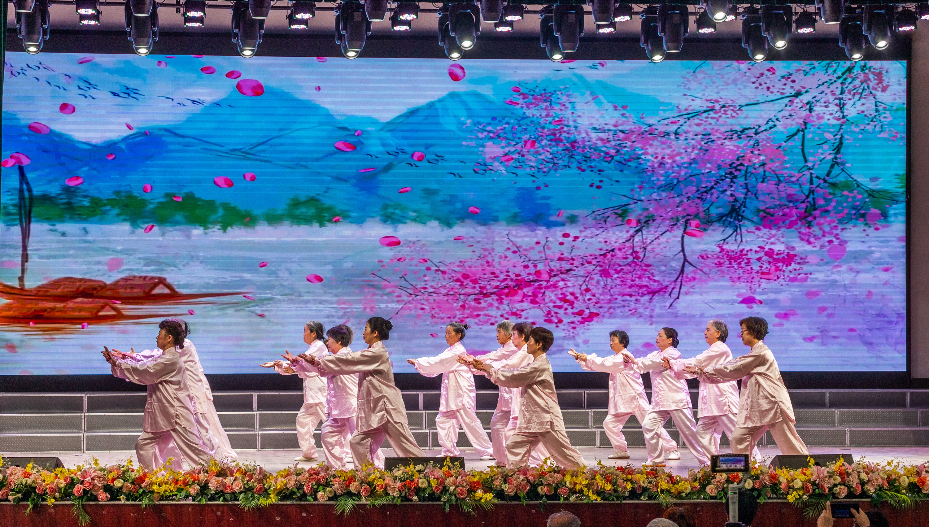 會(huì)后,校領(lǐng)導(dǎo)和老壽星們合影留念、共同觀看文藝匯演。舞蹈《領(lǐng)航》拉開(kāi)了文藝演出的序幕,老同志們表演了民族舞、古典舞、柔力球、太極拳、腰鼓舞、大合唱等節(jié)目,生動(dòng)地展示了老同志積極向上的風(fēng)采,贏得現(xiàn)場(chǎng)的陣陣掌聲。