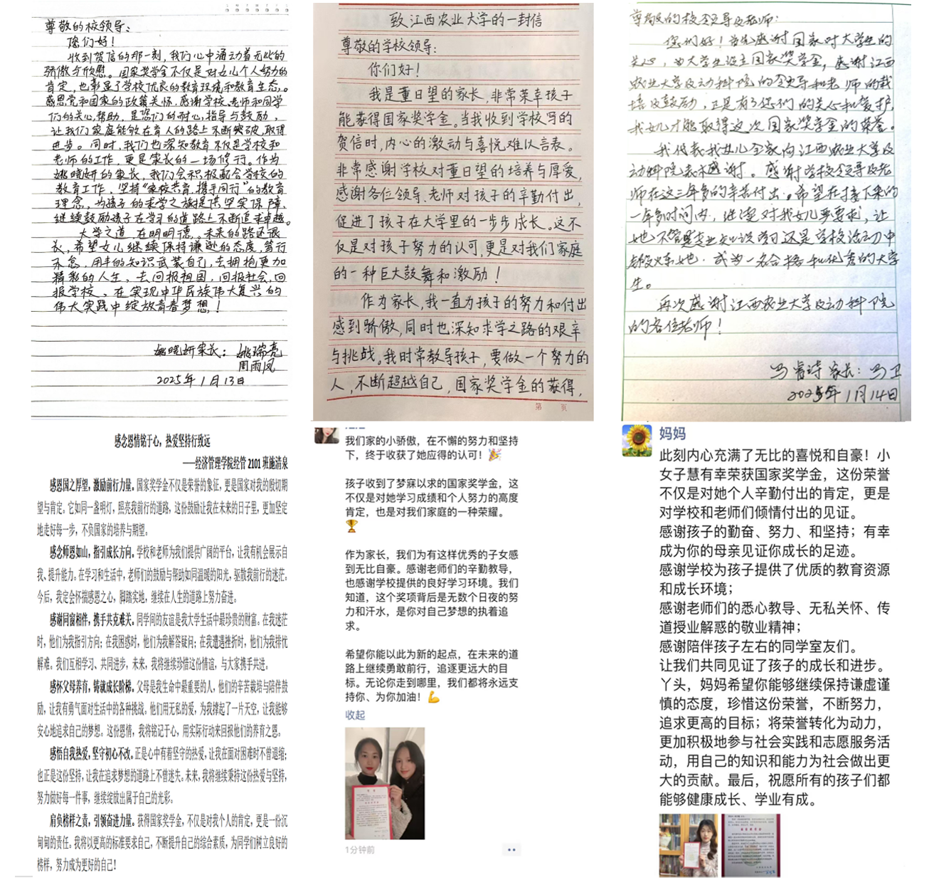 賀信的發放不僅是對我校優秀學子志存高遠、勤奮好學、追求卓越、突破自我的肯定,也是對家長悉心栽培、全力支持學校人才培養工作的感謝。獲獎學生及家長收到賀信后分外驚喜,紛紛通過感謝信和朋友圈等方式將這份喜悅之情進行分享和傳遞。獲獎學生紛紛表示,將帶著榮譽接續奮斗、勇攀高峰,努力成為一名全面發展的新時代大學生。法學2202班姚曉妍家長激動的說:“收到賀信的那一刻,我們感到無比的驕傲與欣慰,感恩黨和國家的政策關懷,感謝學校、老師和同學的關心幫助。我們一定會堅持與學校攜手同行,為孩子的求學之路提供堅實保障,希望孩子能夠在學校的教育培養下成長成才、放飛夢想。”