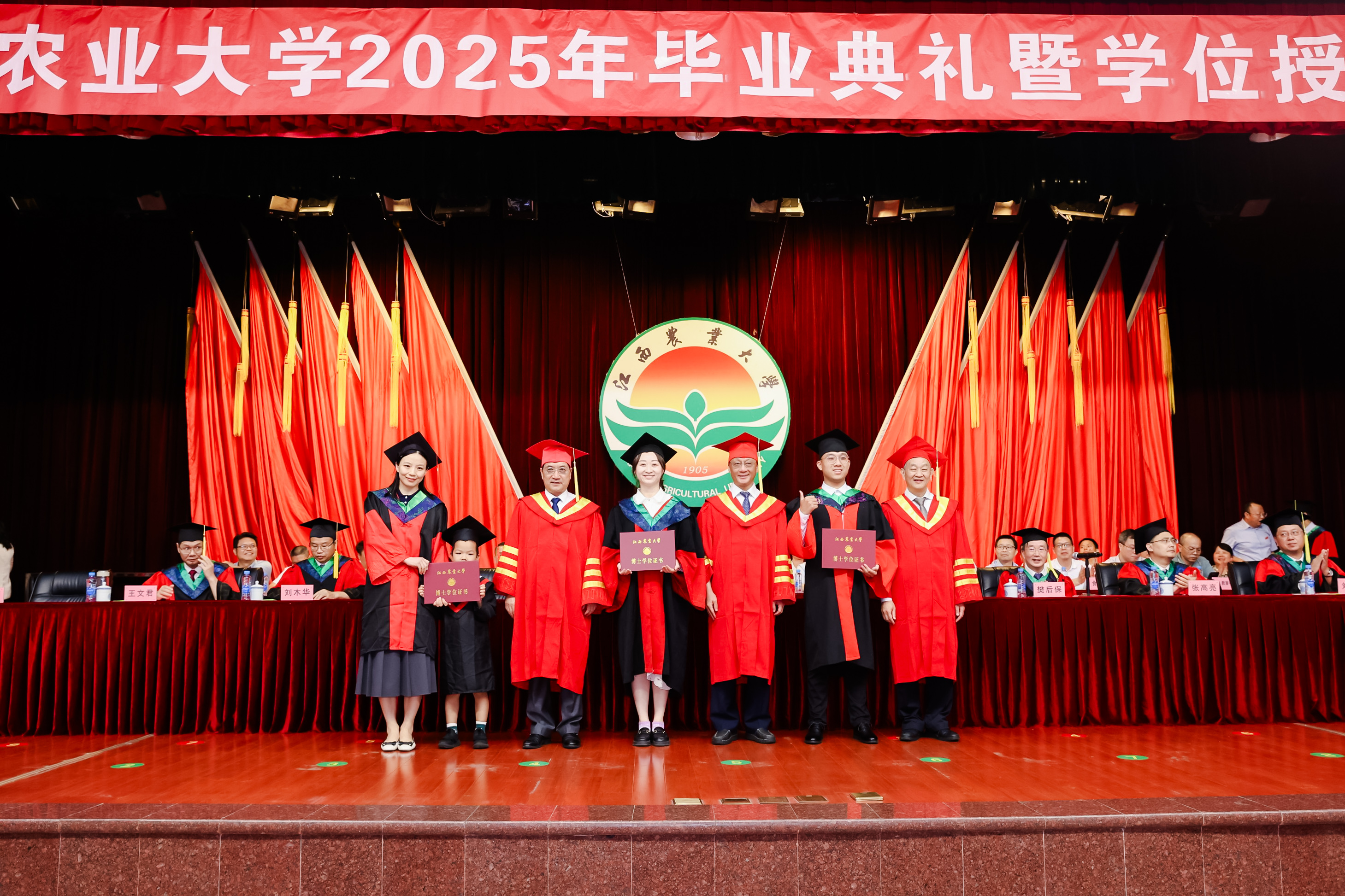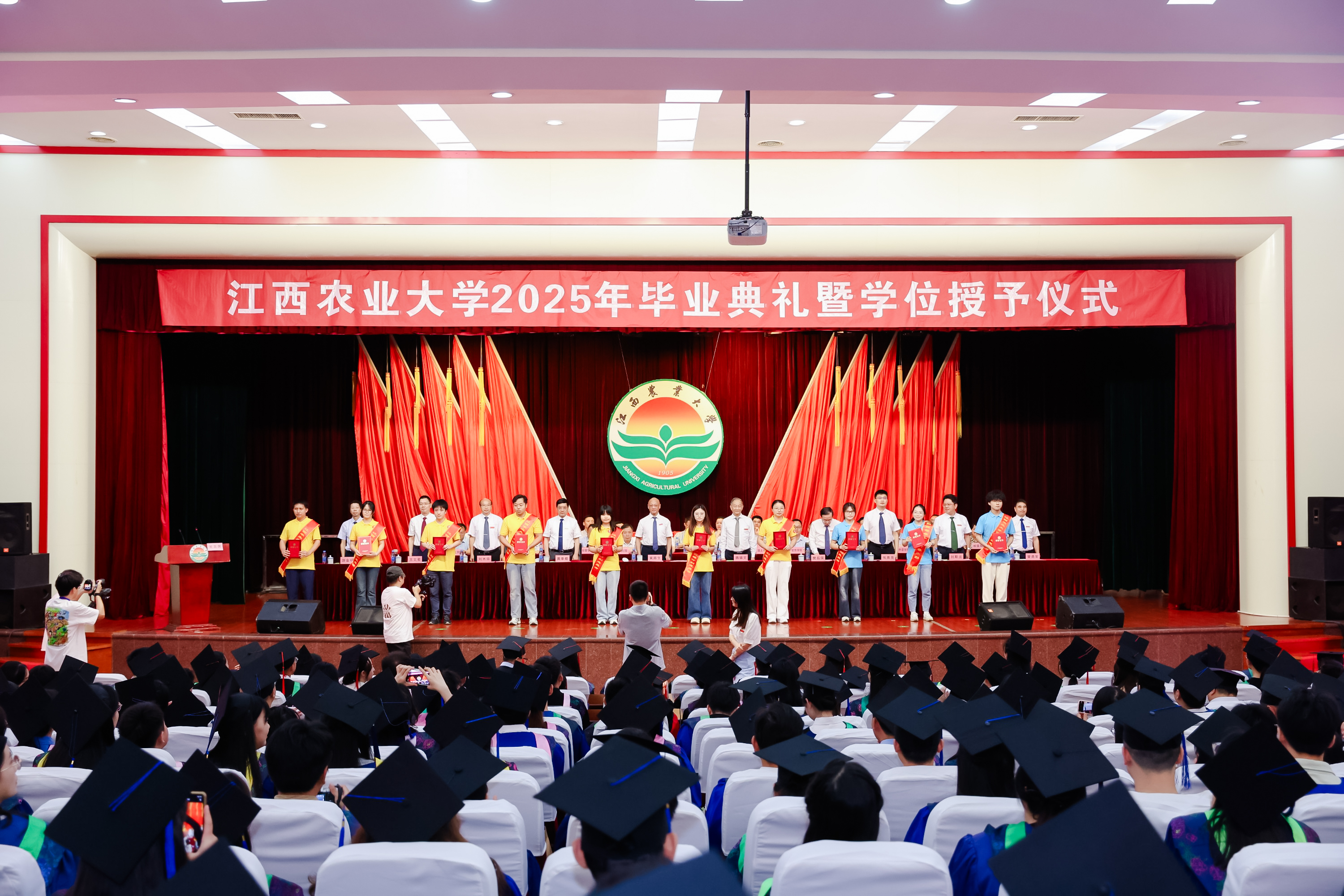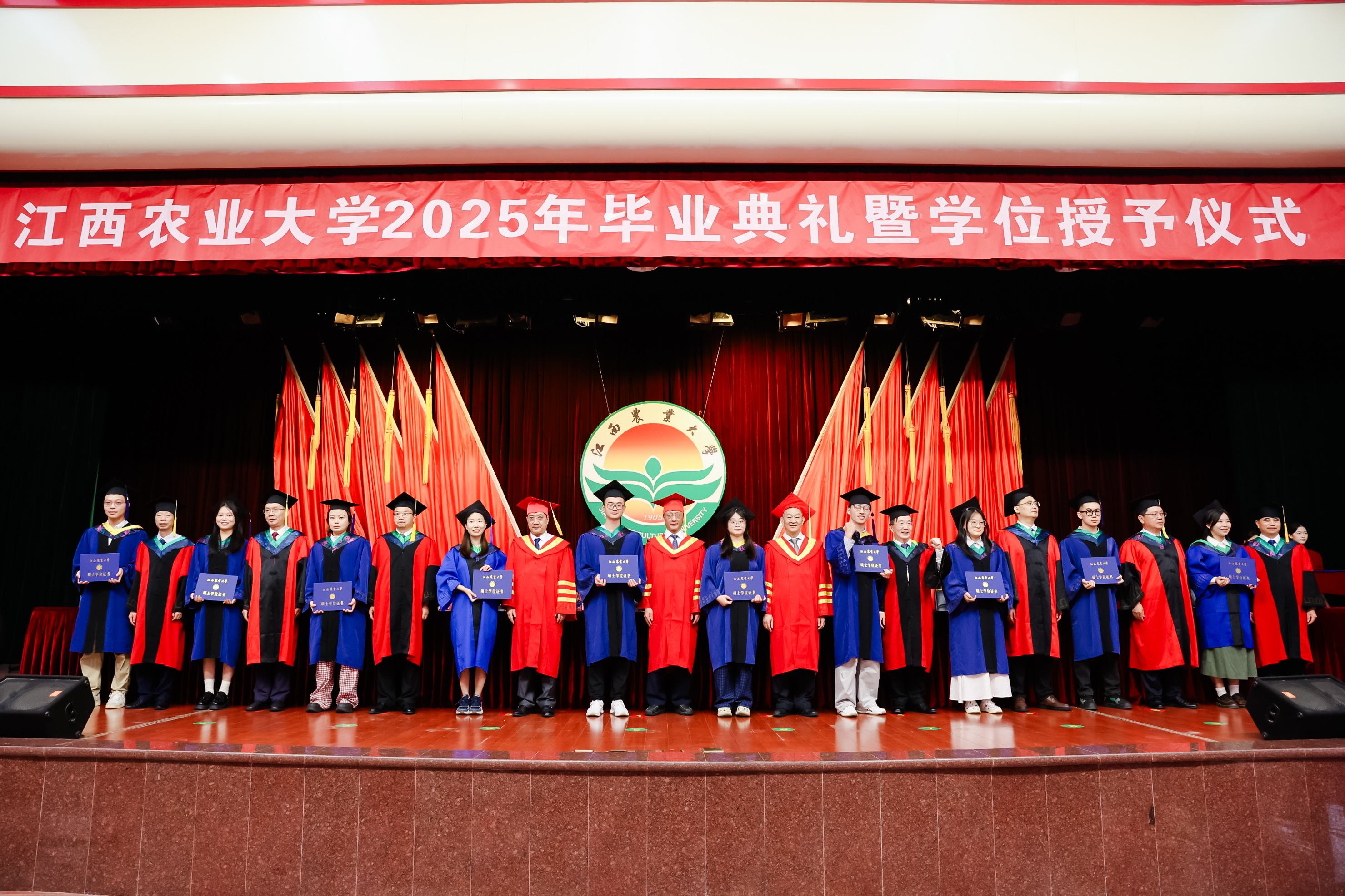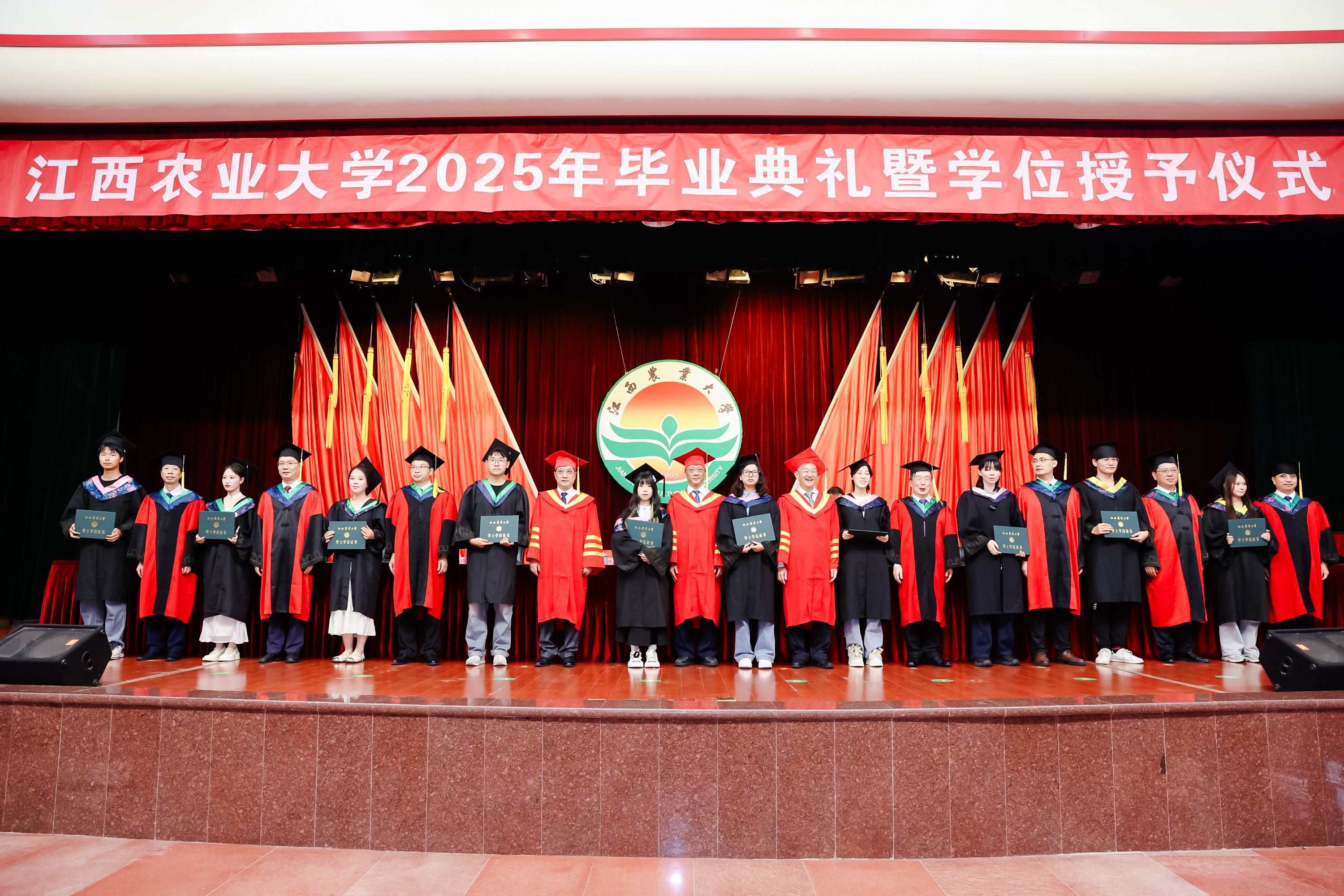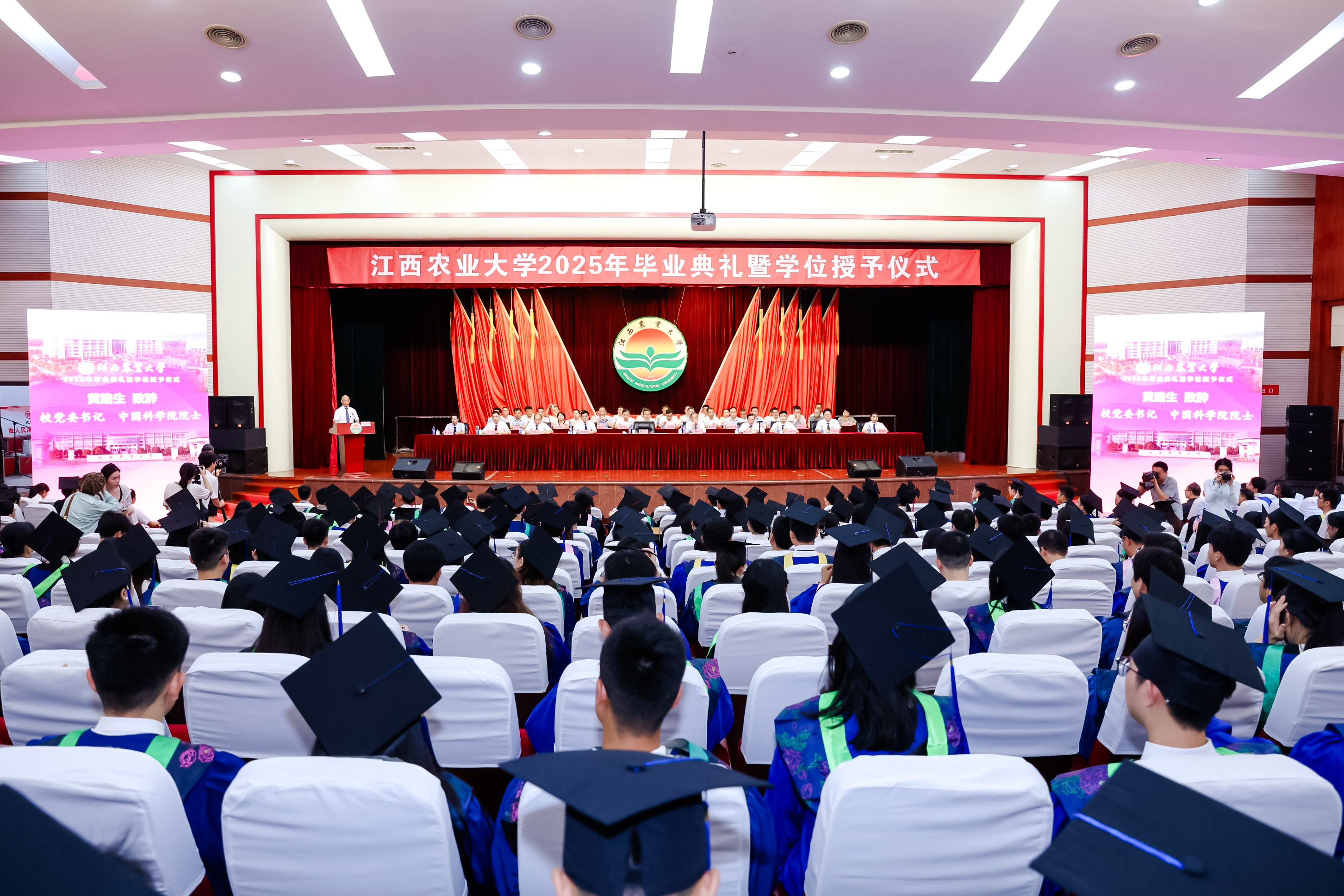 梅嶺山下,驪歌唱響。奔赴山海,鵬程萬里。6月25日上午,我校2025年畢業典禮暨學位授予儀式在逸夫報告廳隆重舉行。校黨委書記、中國科學院院士黃路生深情寄語,中國科學院院士、江西農業大學藍冠噪鹛國家保護研究中心主任魏輔文,發展中國家科學院院士、北京大學現代農學院院長、江西農業大學學術委員會主任、鄉村振興戰略研究院院長黃季焜及全體在家校領導為畢業生代表撥穗、授予學位證書。副校長樊后保主持典禮。