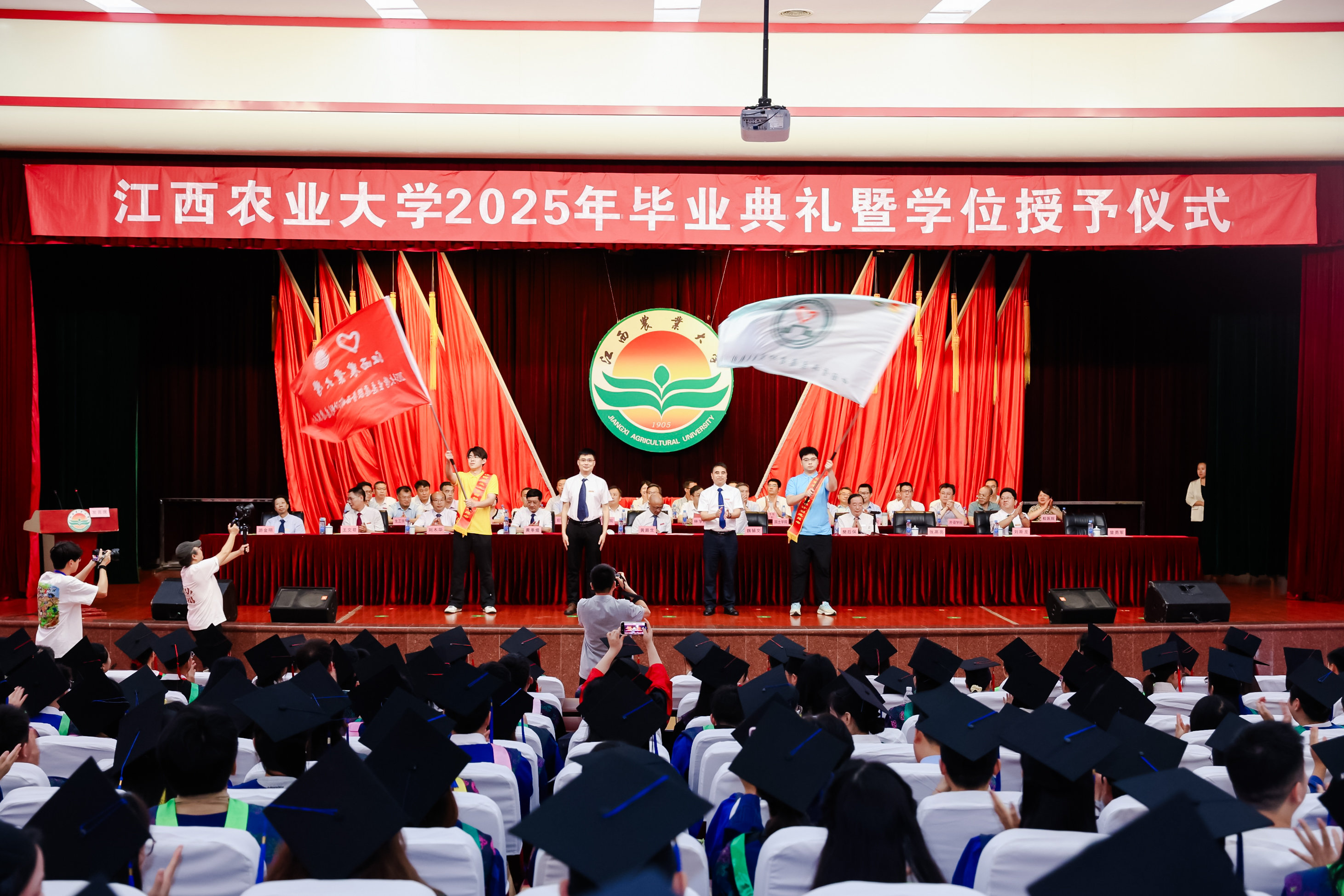 副校長張高亮、曾勇軍分別為學校2025年西部計劃志愿服務團和第27屆研究生支教團授旗。副校長劉木華宣讀《關于表彰 2025 屆優秀畢業生的決定》;副校長王文君宣讀《江西農業大學學位評定委員會關于授予蔡金平等相應學位的決定》。