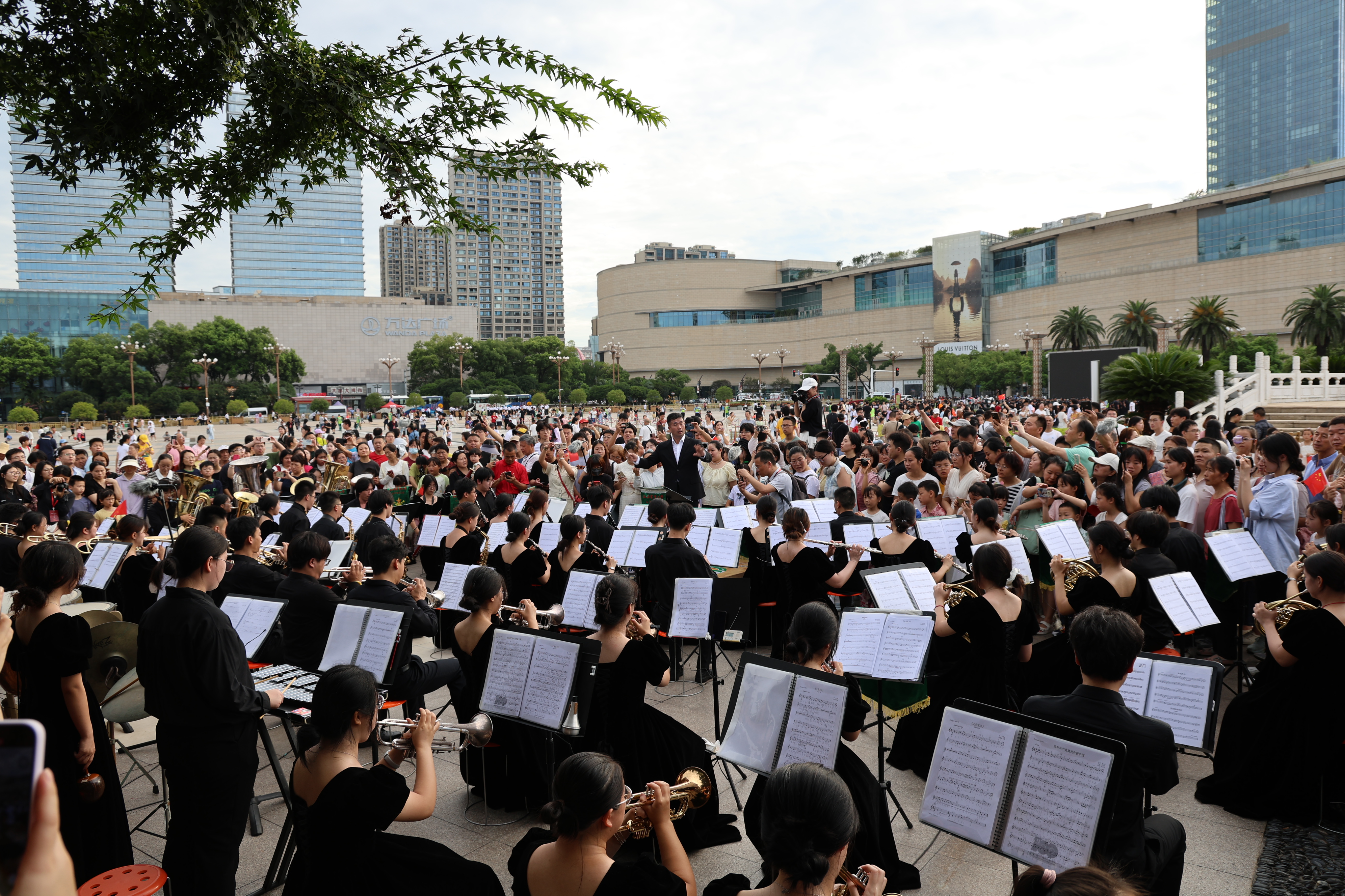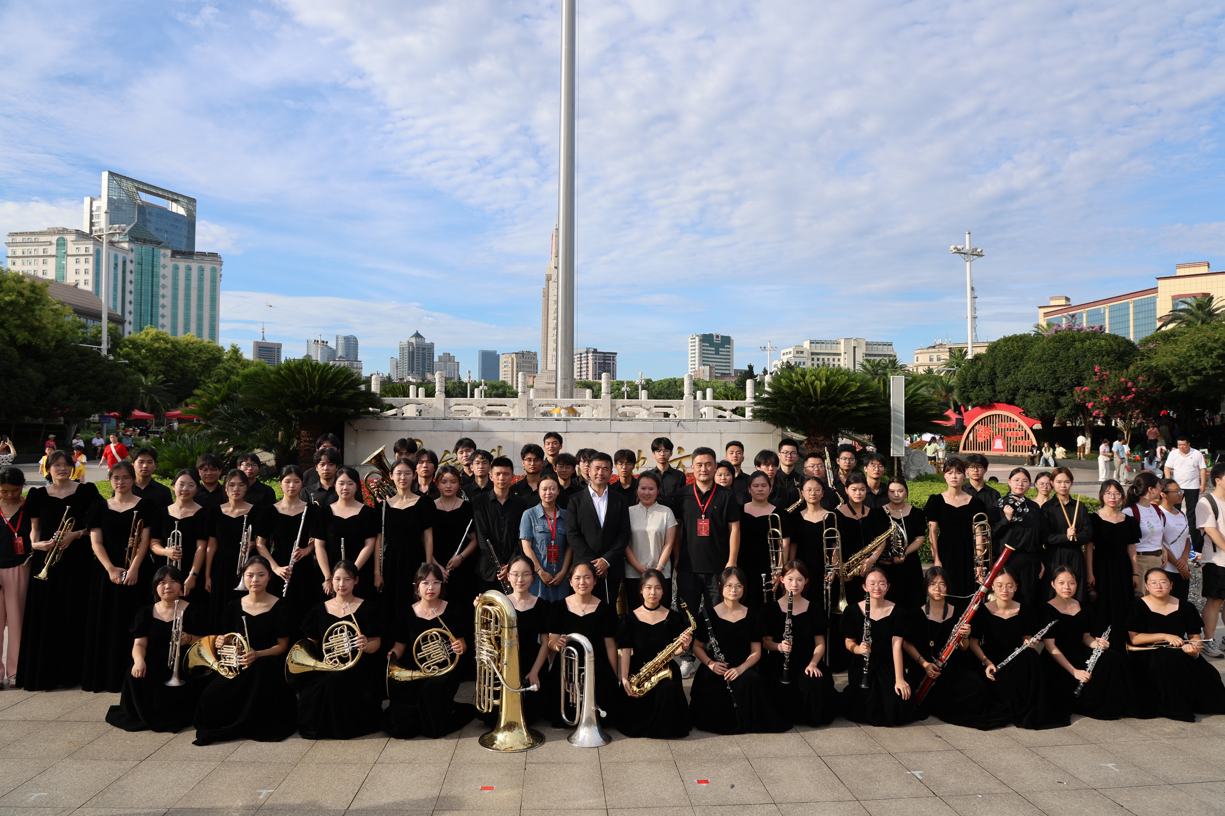 為呈現最佳演出效果,校團委高度重視,積極組織大學生軍樂團刻苦訓練,反復打磨每一個音符、每一段節奏。活動當天,軍樂團以飽滿的熱情、精湛的技藝帶來精彩表演。當《鋼鐵洪流進行曲》的旋律響起,激昂澎湃的節奏仿佛讓人看到人民軍隊鋼鐵長城般的磅礴氣勢;經典曲目《沒有共產黨就沒有新中國》被深情演繹,嘹亮的號角、整齊的鼓點,抒發對黨的忠誠,表達奮進新時代的豪情壯志。活動尾聲,大學生軍樂團奏響互動曲目《最炫民族風》《走向復興》《歌唱祖國》,喚起了現場觀眾的強烈共鳴,大家紛紛跟唱,歡快的旋律點燃全場熱情。表演結束后,樂團成員與現場觀眾合影留念,定格這一難忘瞬間。